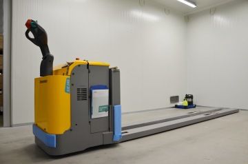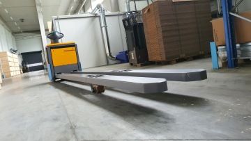 Po společných konzultacích byl vybrán elektrický paletový vozík EJE 340 s délkou vidlí 3.900 mm a nosností 4.000 kg, který umožňuje pohodlnou manipulaci pletacího stroje pouze jedním člověkem. V celé České republice nenajdete žádný vozík, který by se specifikací podobal tomuto.